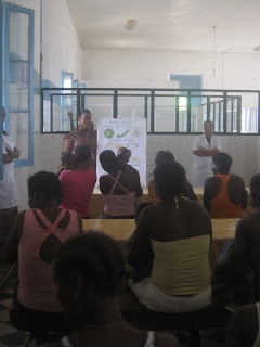 Como já tive oportunidade de referir, foi estabelecida uma parceria com a HELPO em Outubro do corrente ano , que prevê intervenções a nível das comunidades sobre problemas frequentes, incidindo particularmente na prevenção primária. Propôs-se portanto que fossem realizadas sessões sobre Nutrição nos primeiros anos de vida, completando assim o trabalho realizado a nível dos cuidados de saúde do país.